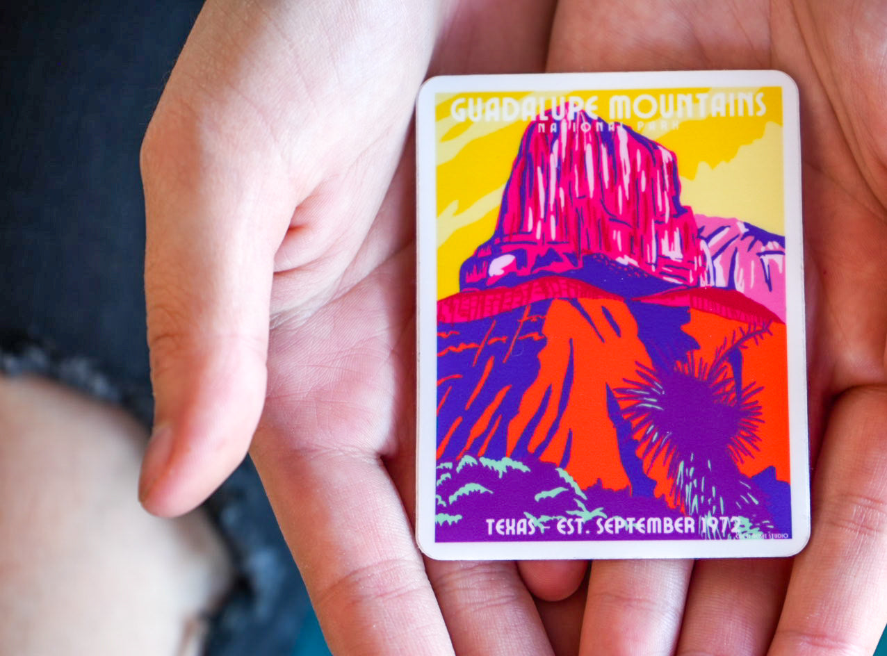 This Guadalupe Mountains National Park sticker highlights the park’s towering peaks rising dramatically above the desert floor of western Texas. Designed with detail, it celebrates the rugged beauty and unique landscape of this remarkable natural area. Perfect for outdoor enthusiasts and national park lovers.